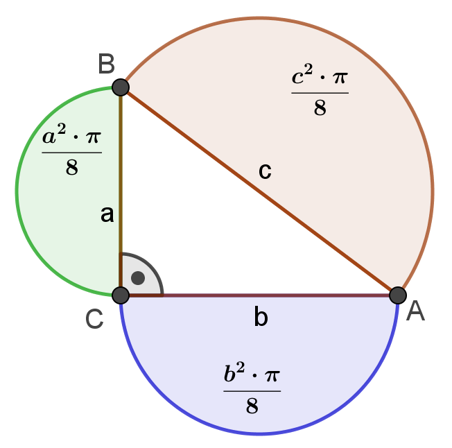 A_a + A_b = \frac{a^2\cdot\pi}{8} + \frac{b^2\cdot\pi}{8} = \frac{c^2\cdot\pi}{8} = A_c \newlineDurch Umformen der Gleichung erhält man: