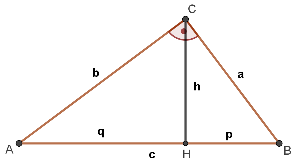 Weil die Höhe h auf die Grundlinie c normal steht, sind die Dreiecke \Delta AHC und \Delta HBC jeweils rechtwinkelige Dreiecke. Wegen des Hauptsatzes gilt für das Dreieck \Delta AHC