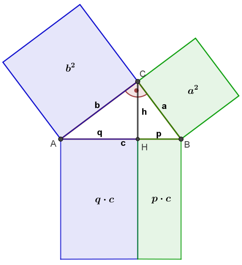- des Quadrats über der Kathete b gleich ist dem Flächeninhalt eines Rechtecks mit den Seitenlängen q und c (in nebenstehender Abbildung blau eingefärbt): \boxed{\mathbf{q\cdot c = b^2} }